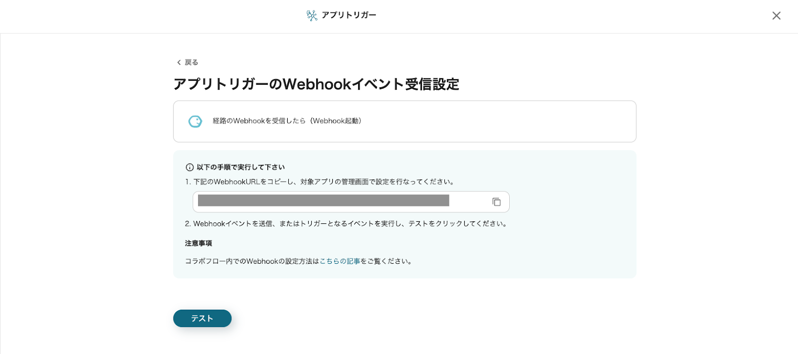 次に、表示されているWebhookURLをコピーし、コラボフロー内で設定を行ってください。 詳しくは、コラボフローの公式サイト をご確認ください。