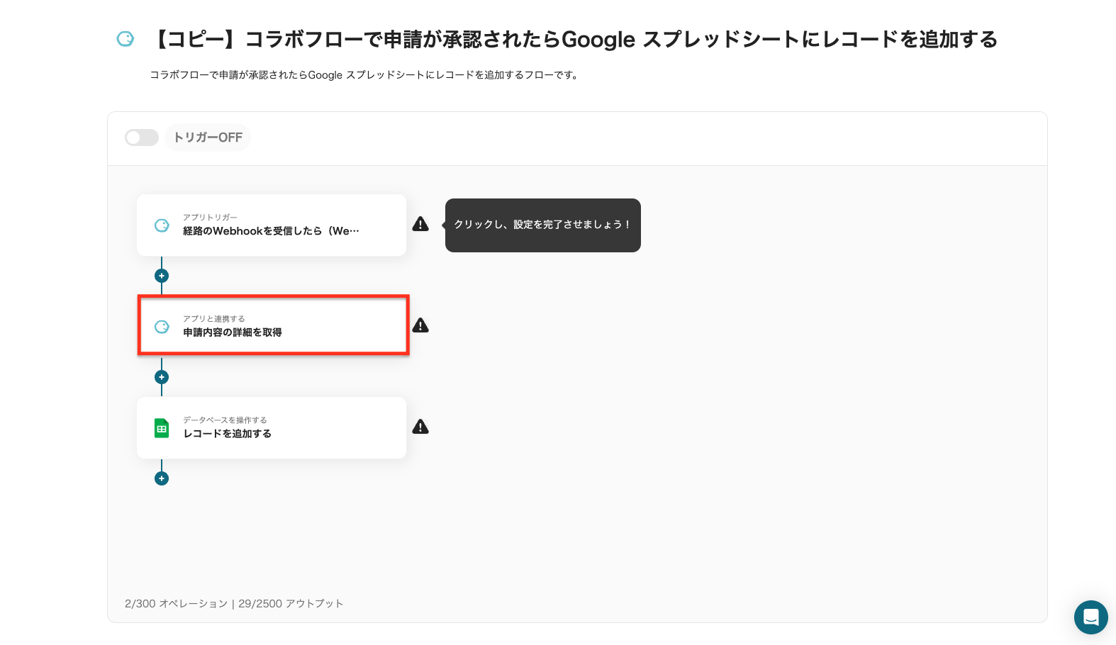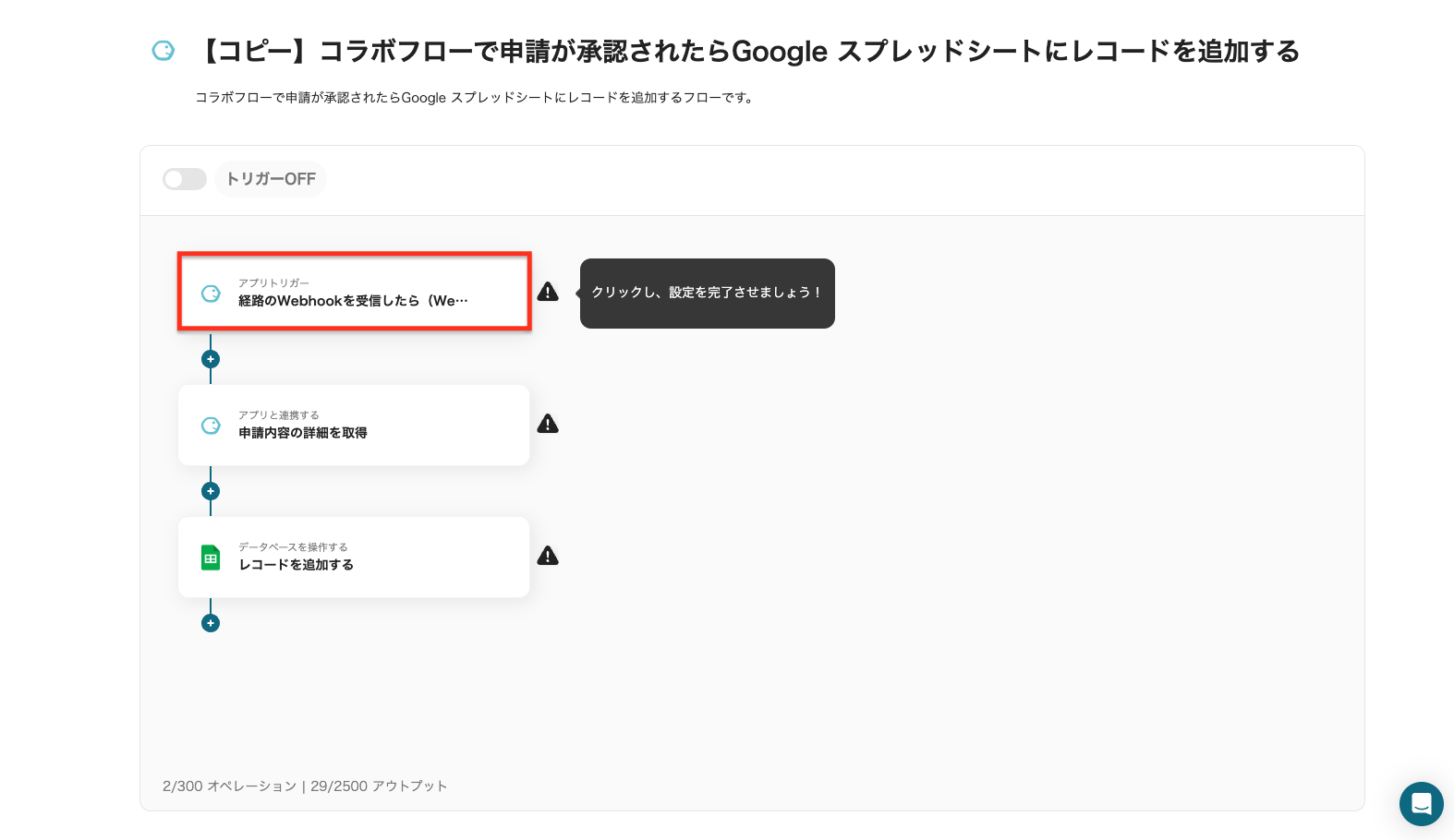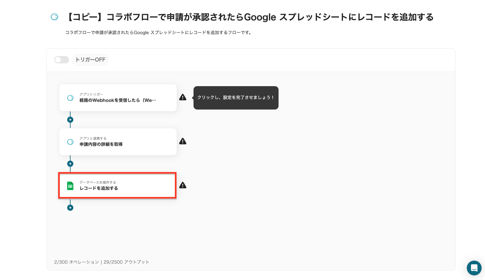 ステップ6:トリガーをONにしてフローの動作確認 全ての工程が設定されると、設定完了のコンプリート画面が表示されます。 以下の画面の赤枠部分「トリガーをON」ボタンをクリックすると、フローボットが自動的に起動します。