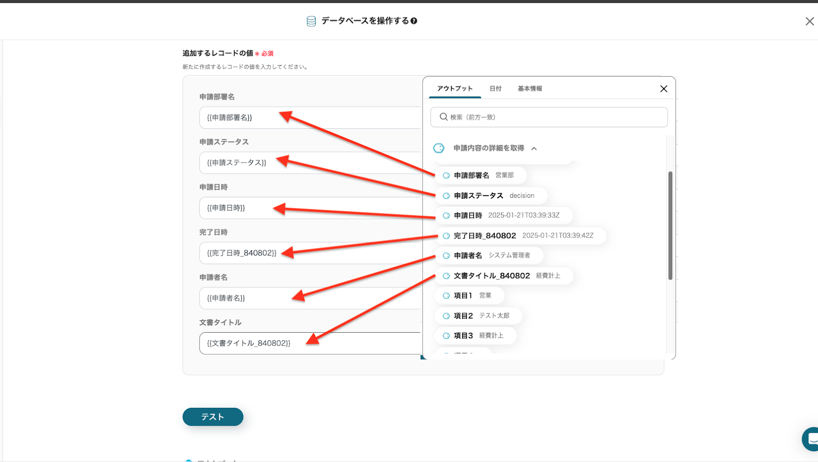 「追加するレコードの値」にて、追加するデータの設定を行います。 入力欄をクリックして、「取得した値」から追加するデータを選択してください。 追加後に、「テスト」をクリックしましょう。