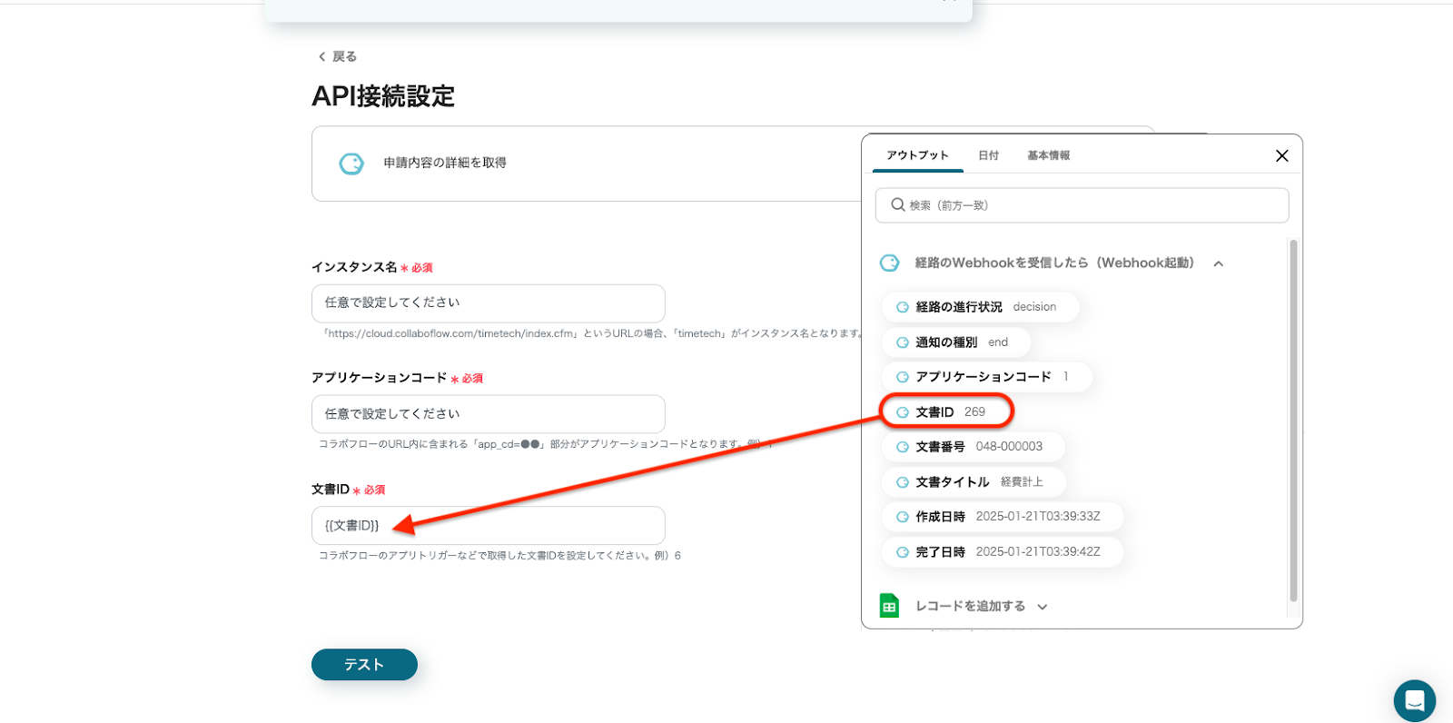 「インスタンス名」と「アプリケーションコード」は、注釈を参照し、URLから引用してください。 「文書ID」は、入力欄をクリックして「取得した値」からを選択してください。 設定が完了したら、「テスト」をクリックしてください。