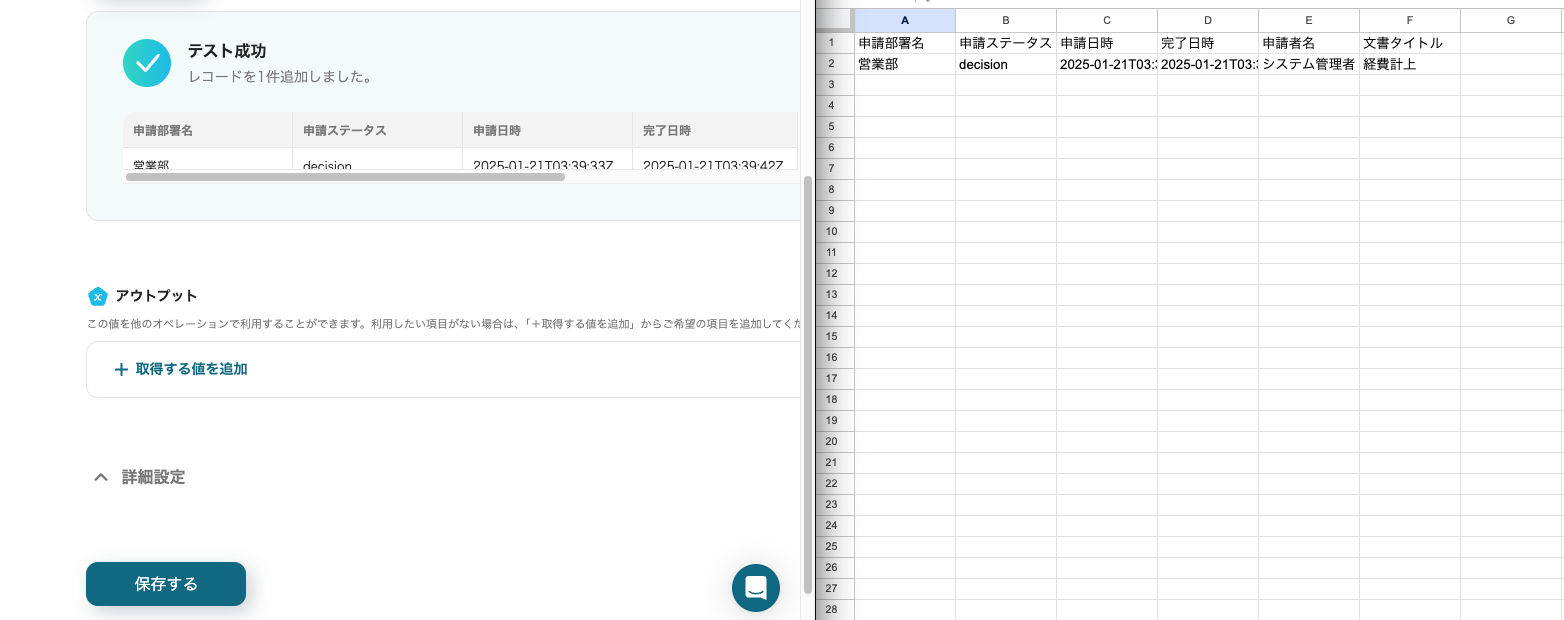 指定したGoogle スプレッドシートにデータが自動追加されていることを確認したら、「保存する」をクリックしてください。