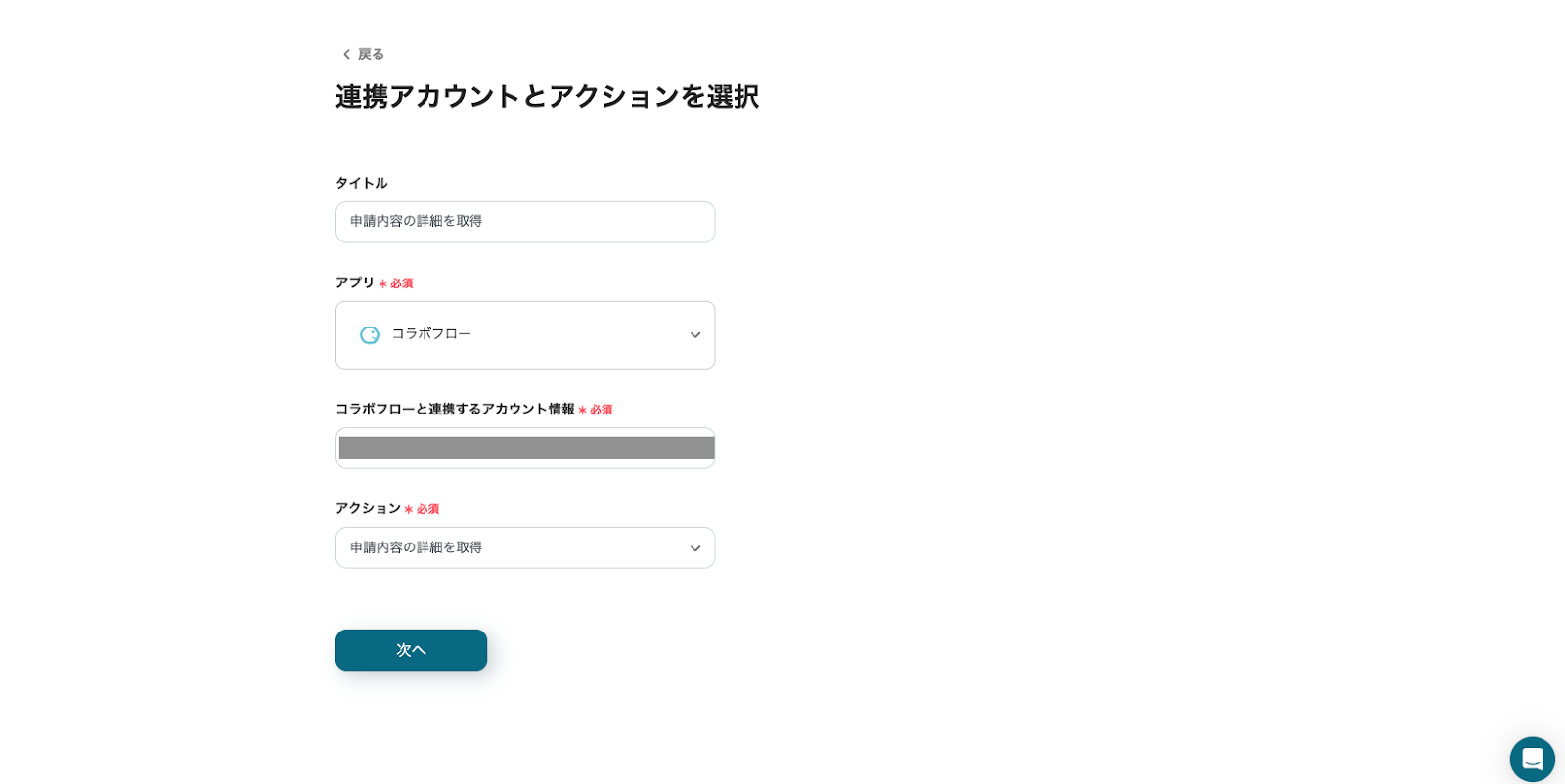ステップ4:コラボフローのアクション設定 次に、コラボフローから申請データを取得する設定を行います。 「申請内容の詳細を取得」をクリックしてください。