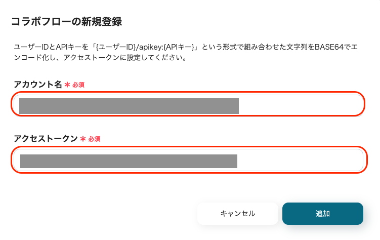 エンコード後の文字列を「アクセストークン」に入力して「追加」をクリックすると、コラボフローのマイアプリ連携が完了します。