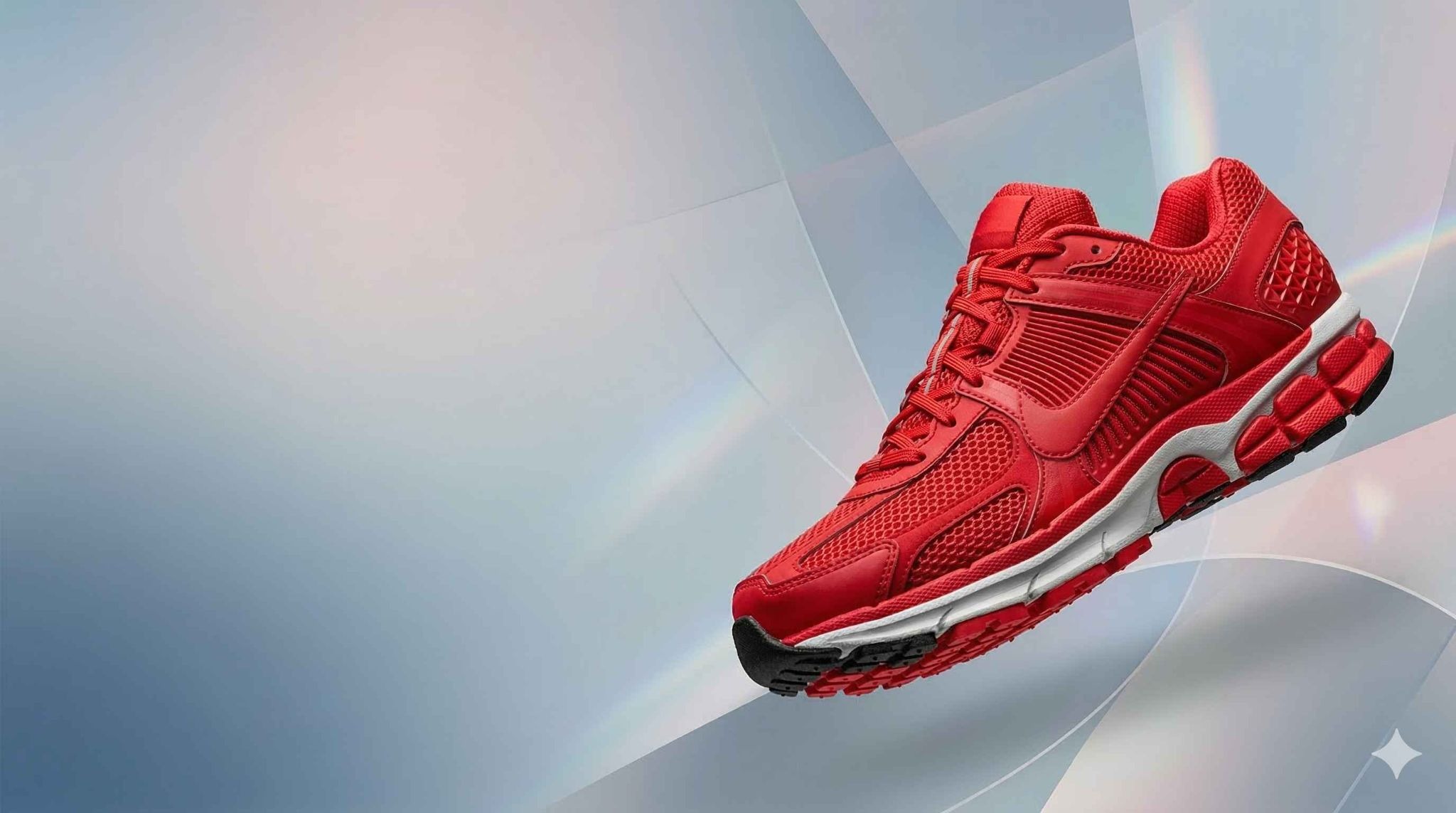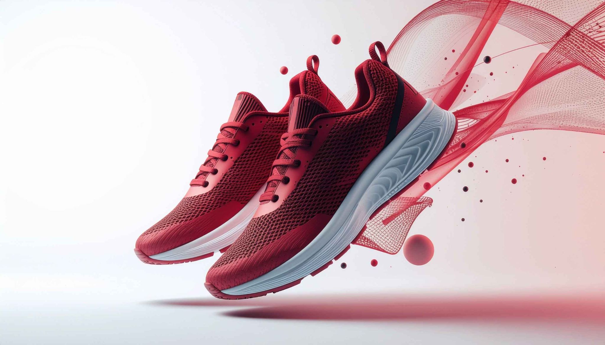 洗練された高性能な赤いスポーツスニーカーが特徴。シューズはメッシュと合成素材の質感の細部までフォトリアルで、特定のブランドロゴや商標がない一般的なデザイン。