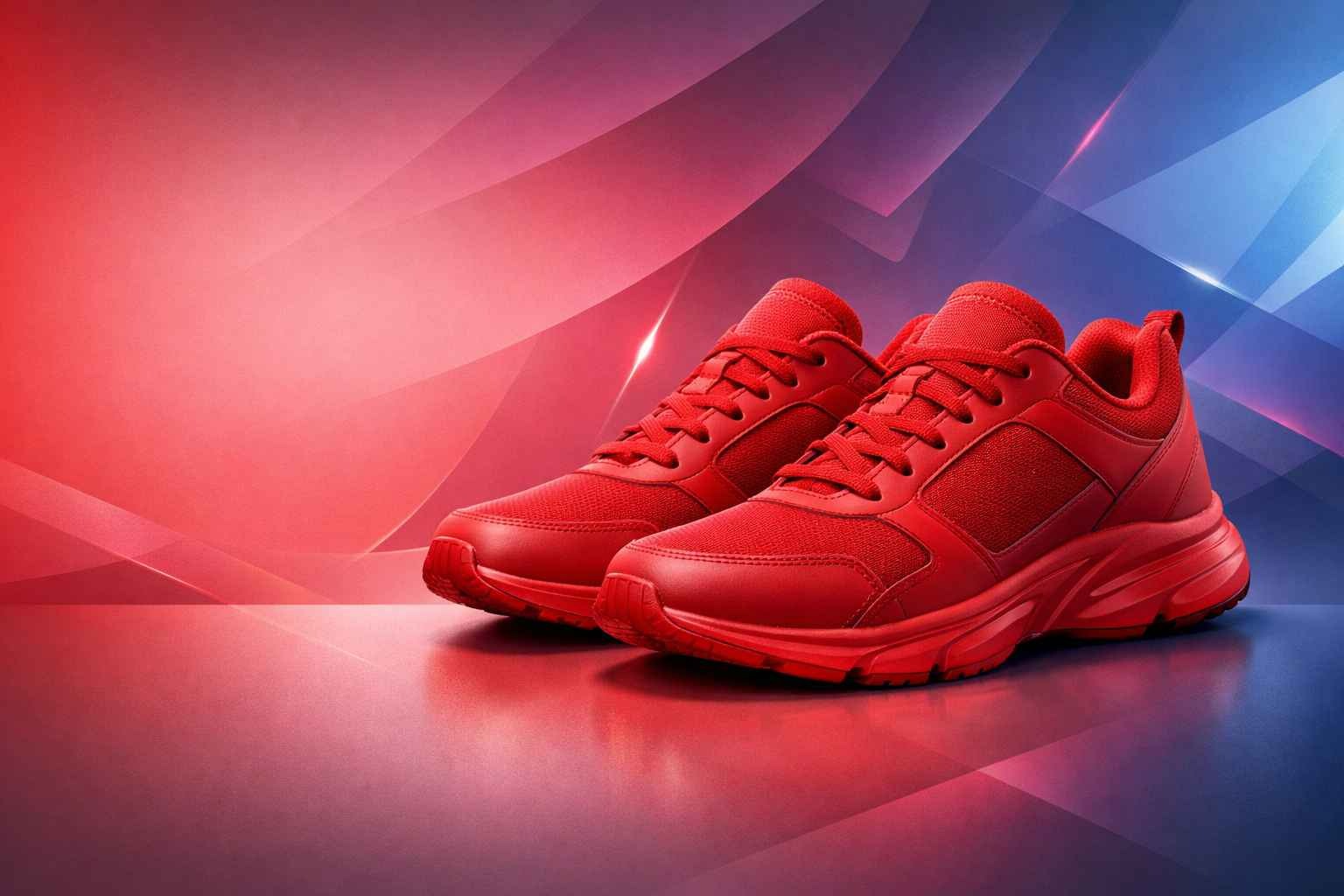 背景は、抽象的な幾何学的形状とモダンなグラデーションを微妙にブレンドして、洗練されたクリエイティブな雰囲気を作り出し、テキストオーバーレイ用に十分なネガティブスペースを側面に確保。ライティングは明るく均一で、シューズの質感を強調。横長のアスペクト比16:9。