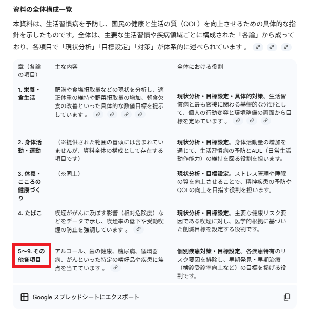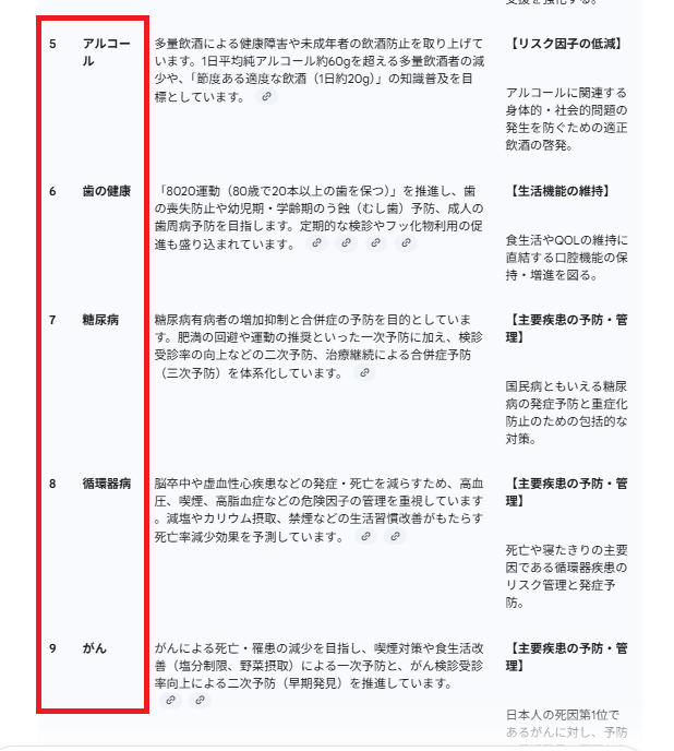 一方で、約25秒をかけて出力するGemini 3 Proは、省略されがちな後半の各論(アルコールや歯の健康等)まで一つずつ正確に網羅します。