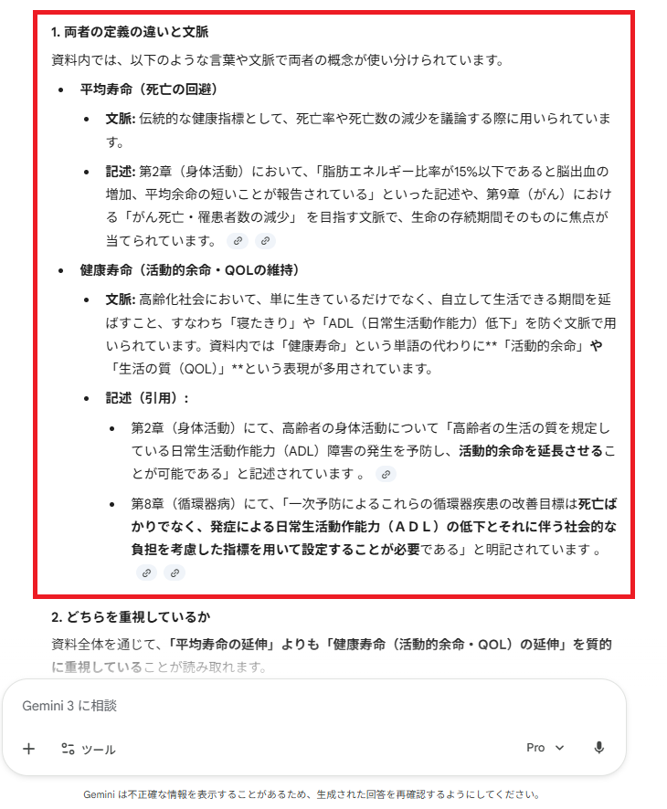 要点をシャープにまとめる解説型の出力をしたGemini 3 Flashと、「QOL・環境・数値目標」の3本の柱に分解する論点整理型の出力をしたGemini 3 Pro、どちらも資料の核心を突いています。