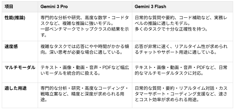 現在は、スピードとコスト効率を重視した「Gemini 3 Flash」と複雑なタスクに対応する「Gemini 3 Pro」の2つがビジネスシーンの主流です。
