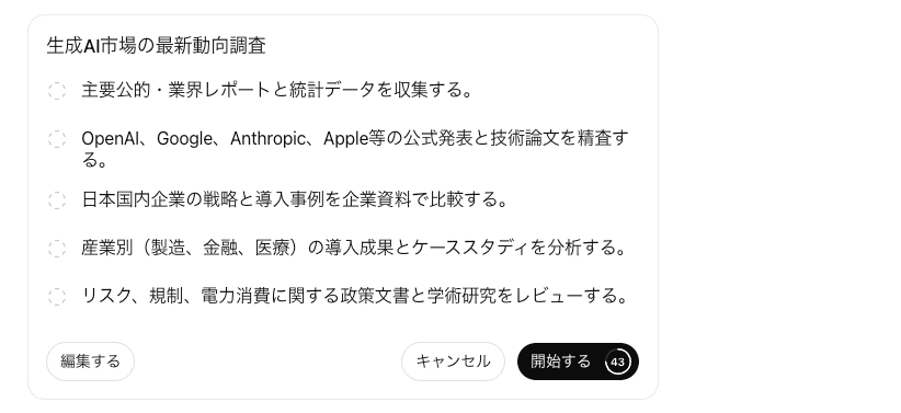 Deep Researchでは、リサーチ開始前に提示される 「Research Plan(リサーチプラン)」の確認・編集機能 が主流となっていますが、ステップ1でChatGPTが提示した「逆質問」に回答し、内容をさらにアップデートさせます。
