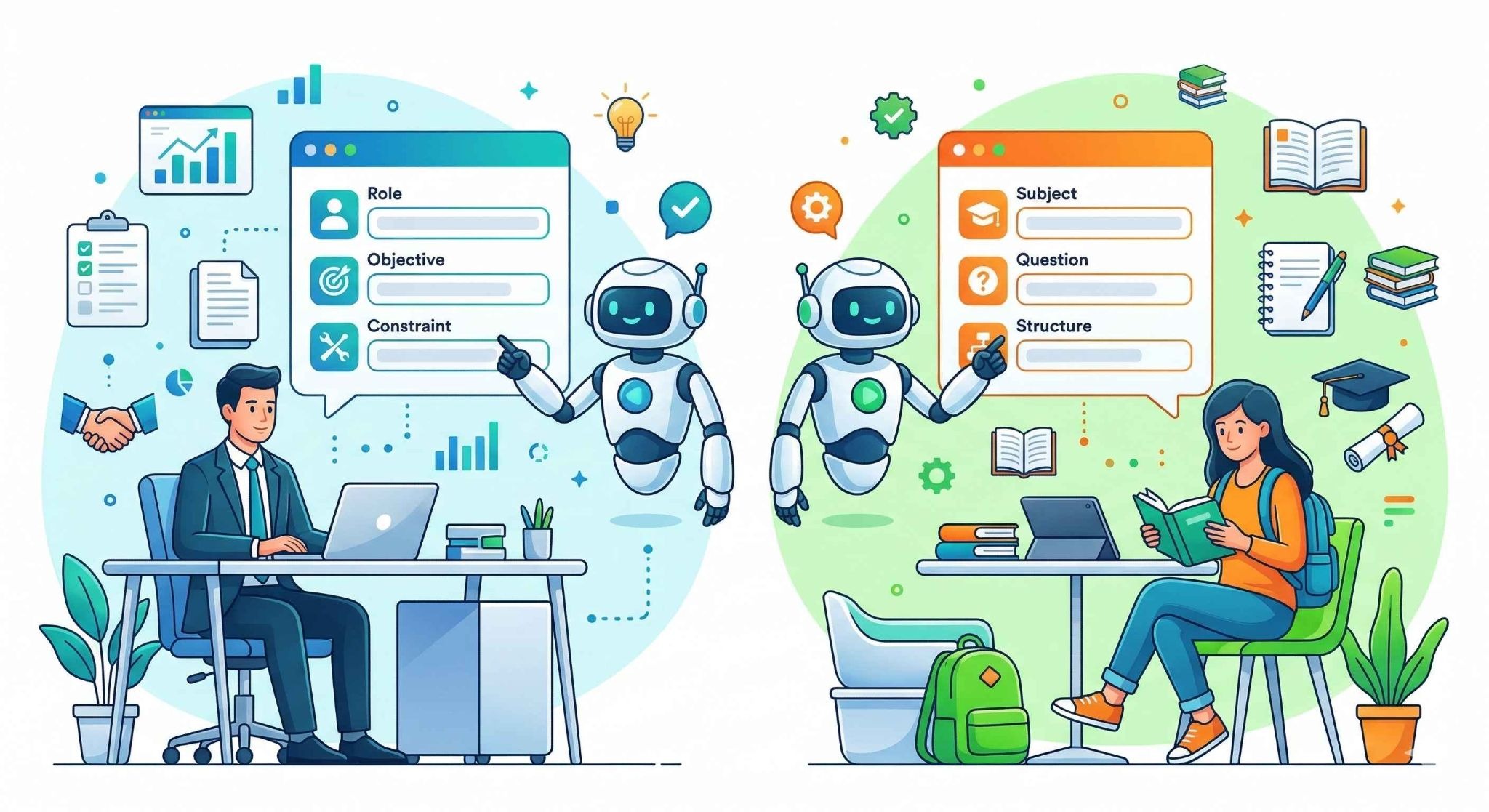 そのままコピー&ペーストして使える実用的なプロンプトテンプレートを、ビジネス向けと学生向けのシーン別に紹介します。[ ]で囲まれた部分を、実際のテーマや内容に書き換えて使用してください。