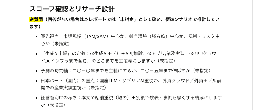 1. まず、このテーマをリサーチするにあたり、不足している情報や「特に重点を置くべき視点(例:技術寄りか、ビジネス寄りか)」について、私に【3〜5つの逆質問】をしてください。