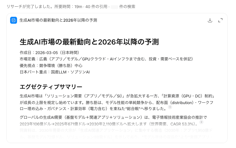 そこでここでは、Deep Researchを使い、リサーチに時間がかかる「生成AI市場の動向」というテーマでレポートを作成してみました。