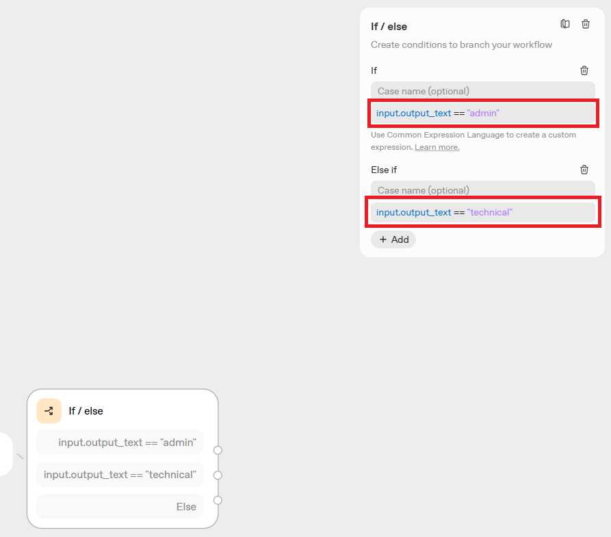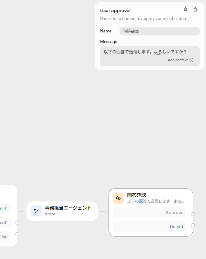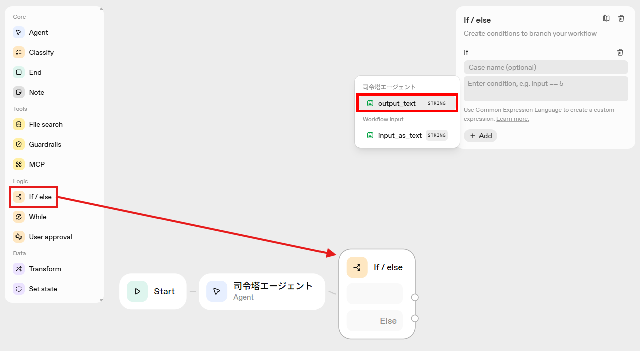 「Agent」ノードの設定は直感的に操作できる一方で、条件分岐の「If/else」ノード設定は、少し苦労しました。