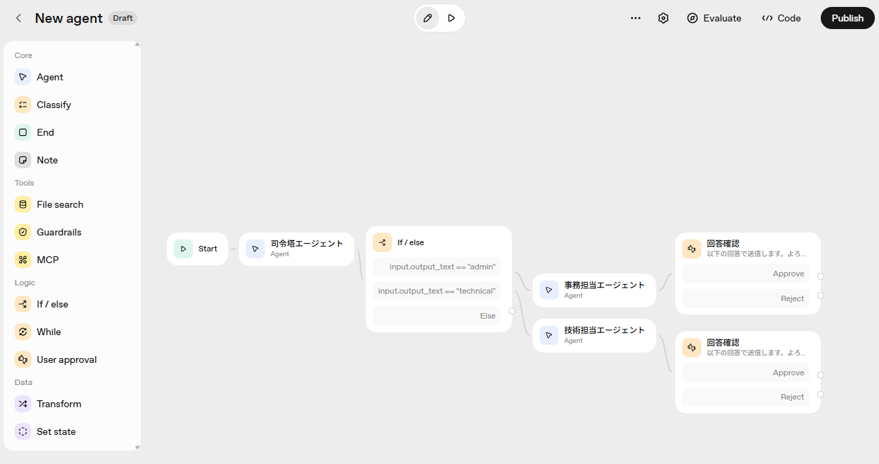 今回は例として、「問い合わせ内容を自動判別し、適切な担当AIに振り分けるエージェント」を作成してみます。