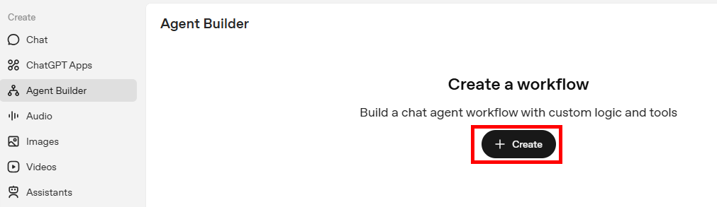 左サイドバーのメニューから「Agent Builder」を選択してページを開くと、エージェントを作成できます。