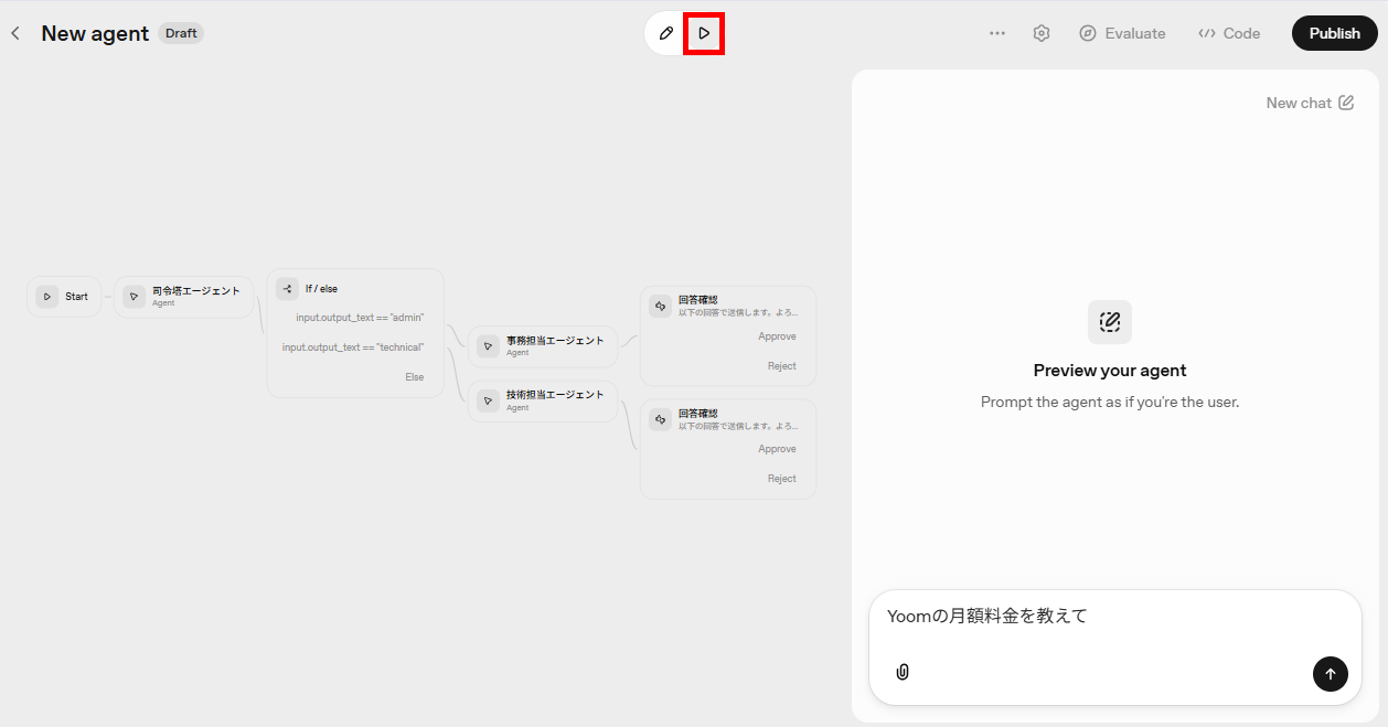 はじめてエージェントを作成したときは、条件分岐の設定が上手くできておらず、プレビュー時にフローが途中で止まりました。