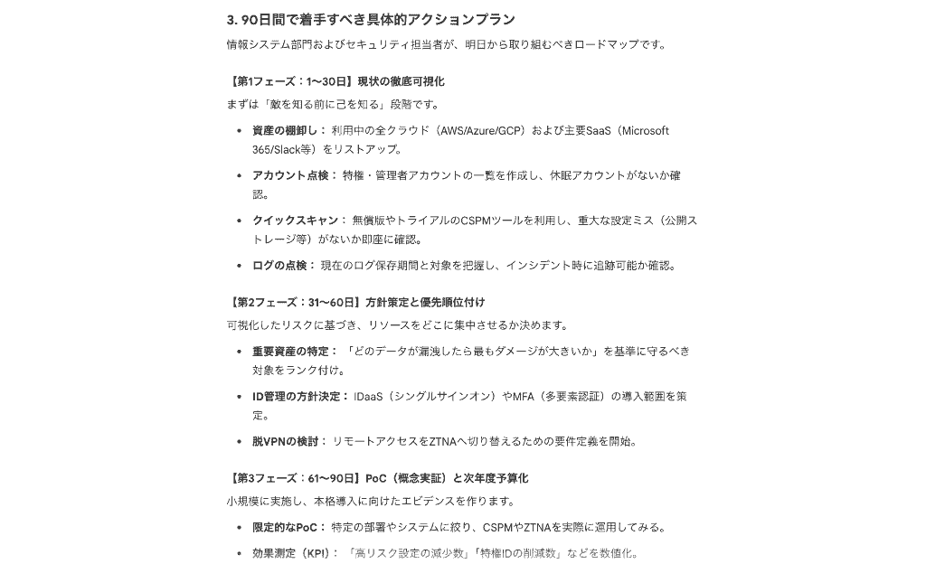 クラウドセキュリティのウェビナー動画を分析してください。 やってほしいこと: ・この動画で話されている主要なテーマを3〜5個に整理 ・動画の流れに沿った時系列の要約議事録(5分刻み程度) ・情報システム部門とセキュリティ担当が、今後90日間で着手すべきアクションプランを具体的に整理 なお、音声だけでなく、スライドに表示されているテキストやグラフの内容も考慮して要約してください。 動画の音声だけでなく、画面に映し出されたスライドのテキスト情報までもしっかりと認識 し、話の展開に沿った見事な議事録を作成してくれました!