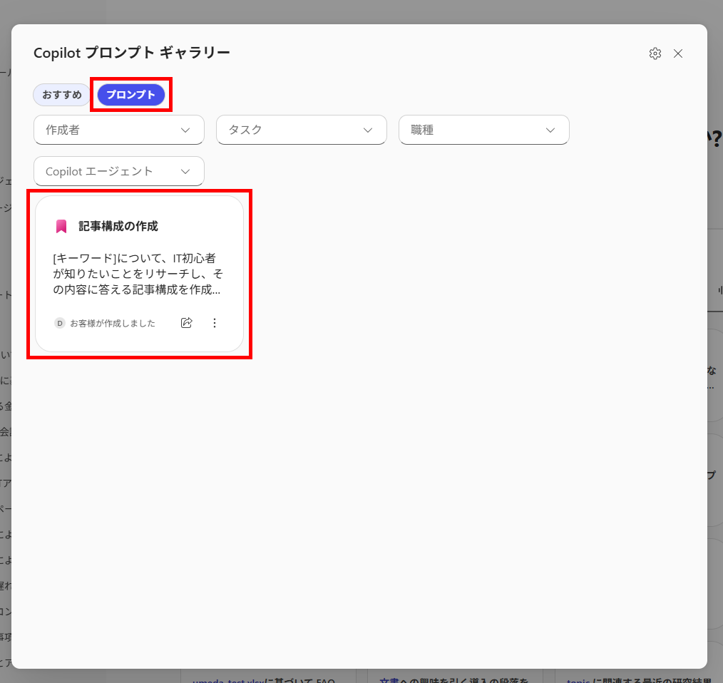 検証1:プロンプトギャラリーへのテンプレート登録 プロンプトギャラリーへテンプレートを登録するには、Copilot Chatに指示を送信する必要があります。