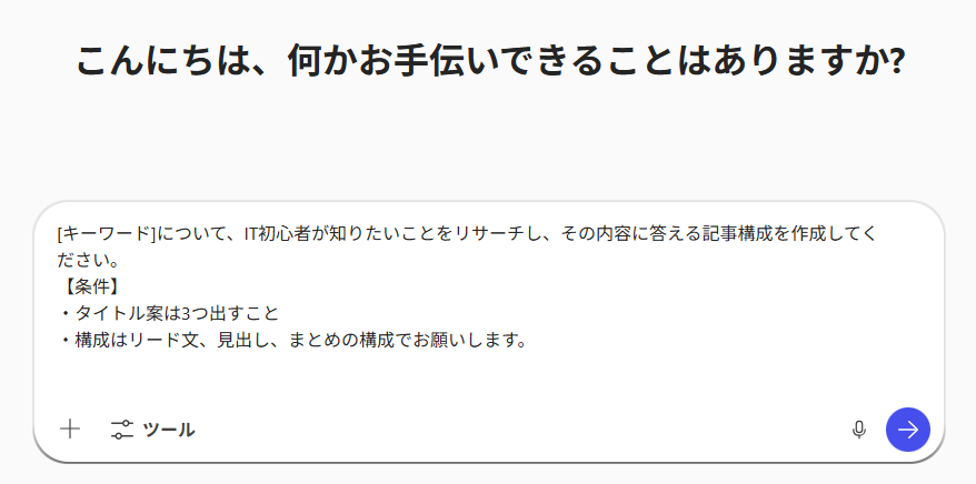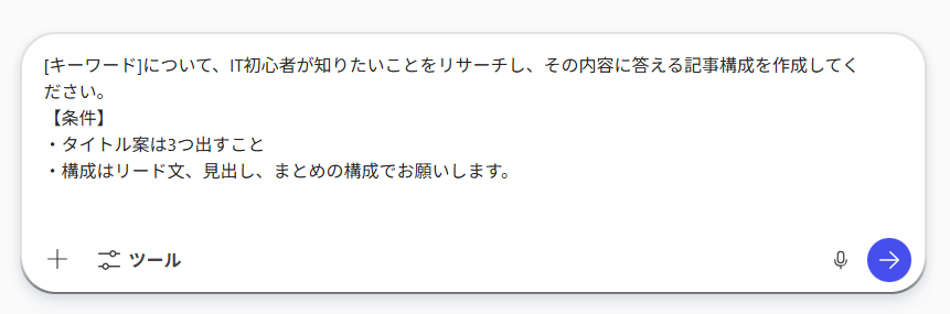 [キーワード]について、IT初心者が知りたいことをリサーチし、その内容に答える記事構成を作成してください。 【条件】