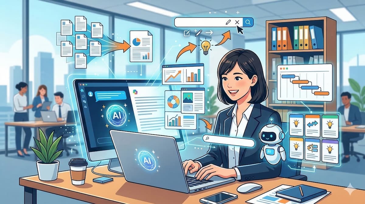 対話形式でAIに指示を出して必要な情報を引き出します。 Webモードを使用すれば、インターネット上の広大なデータから知りたい情報をすぐに検索し、分かりやすく要約してくれます。 さらに、有料のアドオンを導入して職場モードに切り替えることで、社内のドキュメントやチャットの履歴、未読メールの要約までを一手に引き受けてくれます。 会議の前に過去の経緯を素早くキャッチアップしたり、膨大な情報から必要な要点だけを抽出したりする際に非常に役立ちます。 自然言語で気軽に質問を投げかけるだけで、まるで優秀なアシスタントが隣にいるかのように業務をサポートしてくれます。