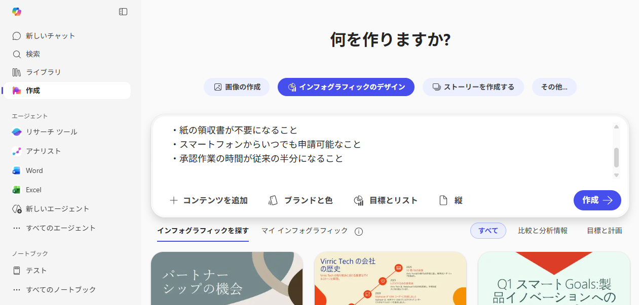 検証2:インフォグラフィックの作成 「作成」タブのインフォグラフィックのデザインを利用して、視覚的なアピールが必要なインフォグラフィックをテキストの指示だけで生成する検証を行いました。
