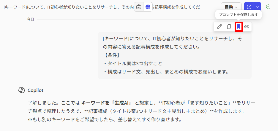 そこで、以下のプロンプトを登録することを想定して、実際にCopilot Chatに送信しました。