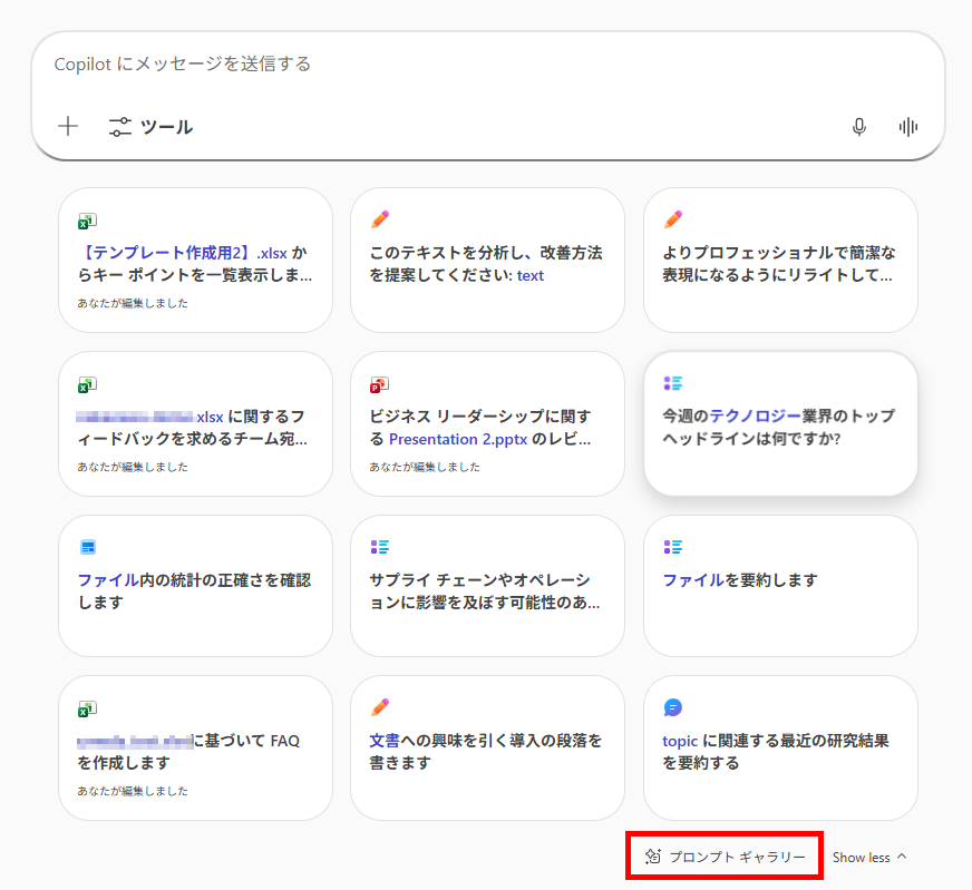 プロンプトギャラリーを活用した指示文の作成 「プロンプトギャラリー」は、AIに対してどのような指示を出せば良いか迷ったときに役立つ、実践的なテンプレート集です。