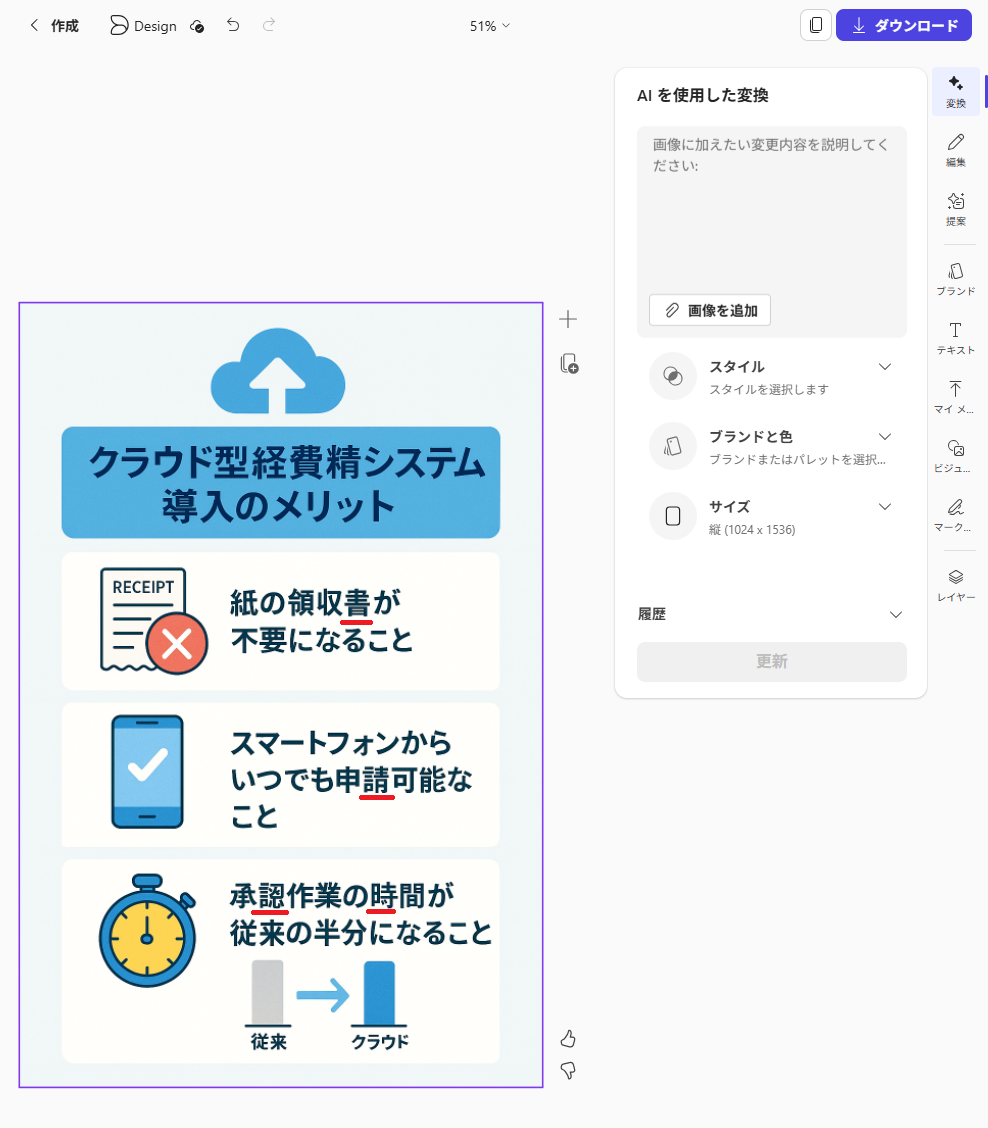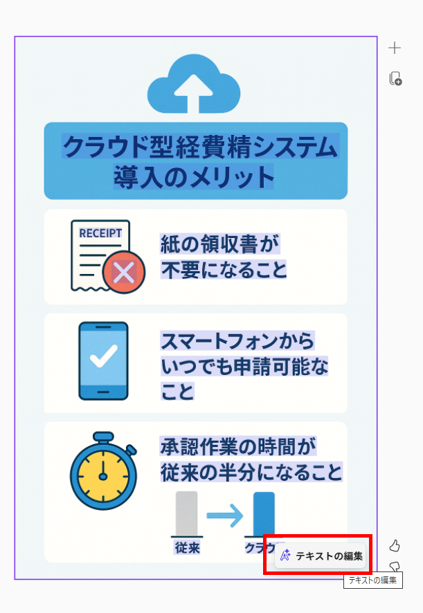 インフォグラフィック生成は、デザインスキルに自信がないビジネスパーソンにとって非常に強力な機能です。 盛り込みたい要素をテキストで指示して少し待つだけで、アイコン付きのレイアウトが整った美しいコンテンツが完成しました。 一から図形を配置して見栄えを整える時間を削減できるため、資料作成の効率が向上します。 また、生成後に「ここを直してほしい」といった部分的な修正をAIにそのまま依頼できる点も便利です。使ってみてわかった課題は、現状の精度では生成された画像内のテキストが崩れてしまうケースがあることです。 そのため、出力後の目視チェックは欠かせません。 それでも、全体のデザインを維持したまま文字部分だけを修正できる機能が備わっているため、少しの手間をかけるだけで実務に十分耐えうる高品質な成果物を作成することができます。
