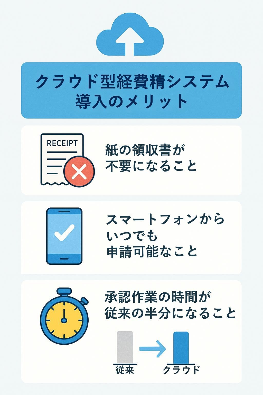 自社で導入する「クラウド型経費精算システム」の導入メリットを社内に周知するためのインフォグラフィックを作成してください。 以下の要素を盛り込んで、分かりやすく視覚的に表現してください。