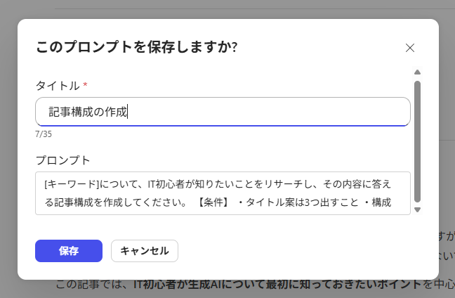 「プロンプト」のメニューを開くと、先ほどの指示が登録されていることが確認できました。