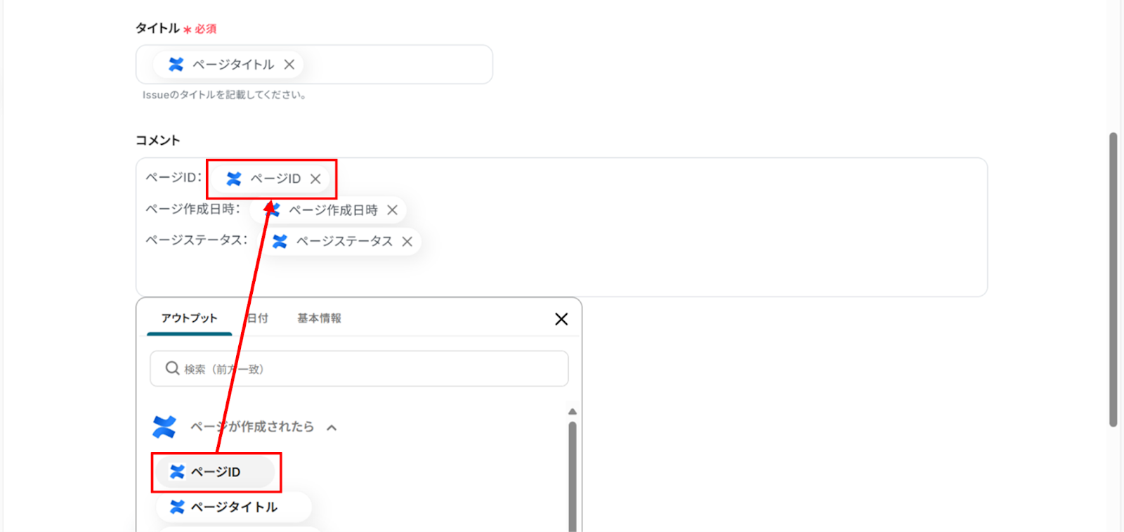 下へ進み、タイトル、コメントにアウトプットを使用して入力することで、Confluenceの情報を引用することができます!
