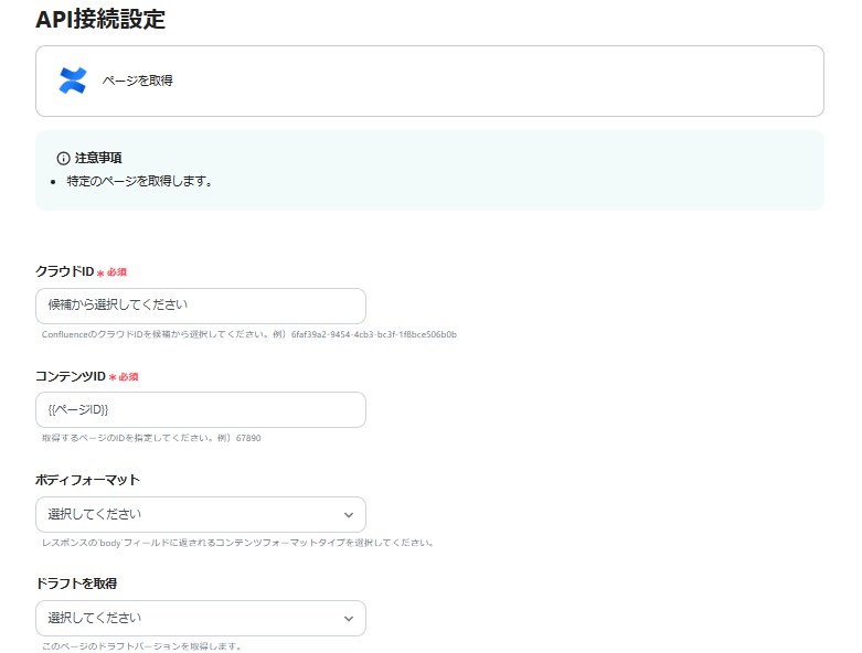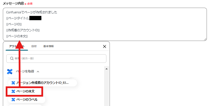 以下の画面では、アウトプットを使用し「ページタイトル」「ページID」「作成者のアカウントID」「ページの本文」をGoogle Chatで確認できるように入力しています。