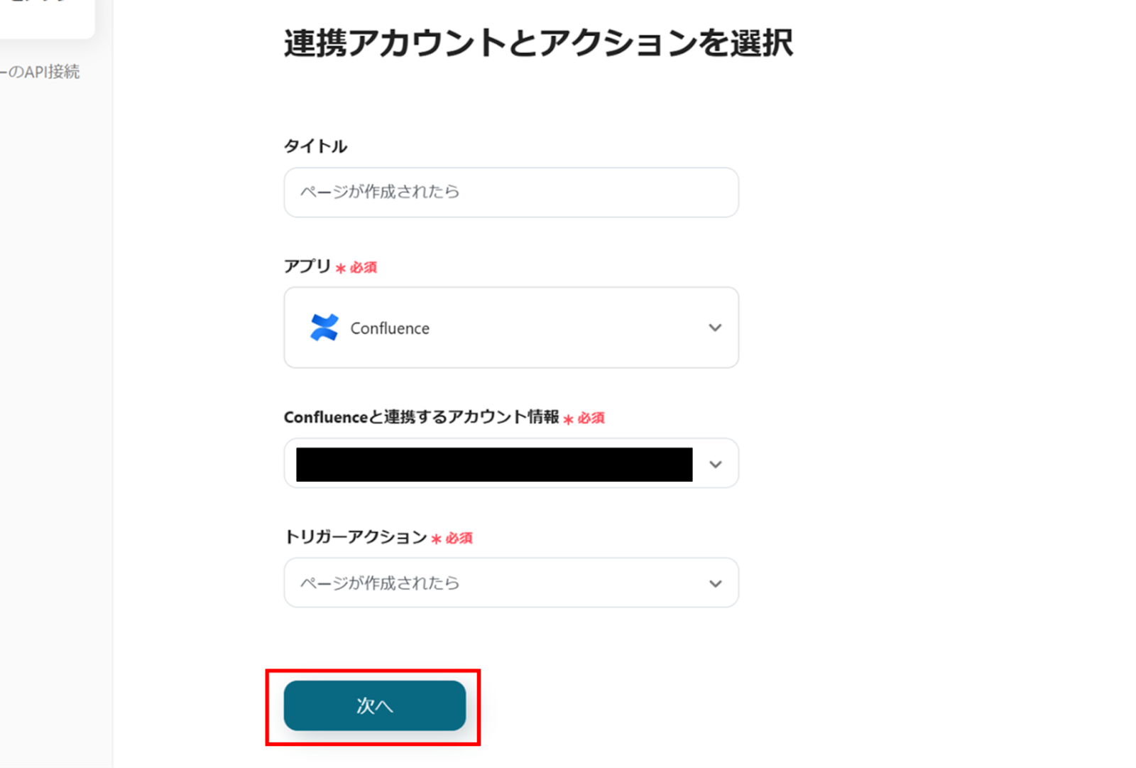 (2)Confluenceの「連携アカウントとアクションを選択」画面から、Confluenceと連携するアカウント情報に誤りがないかを確認し、トリガーアクションは「ページが作成されたら」のままで「次へ」をクリックします。