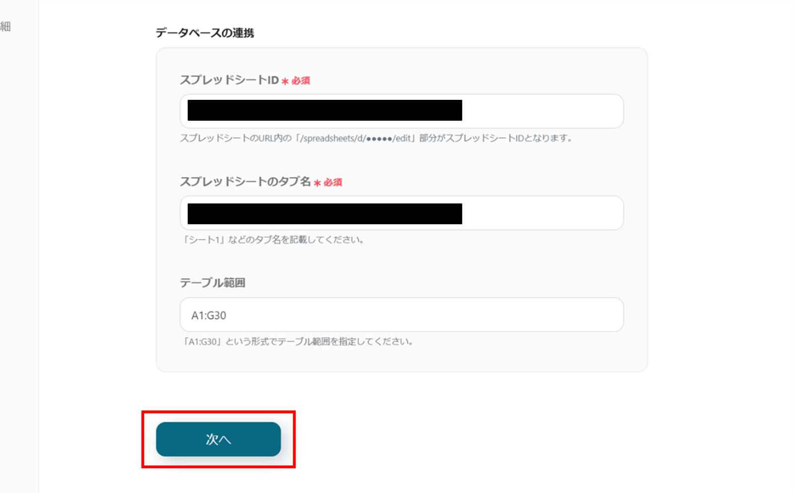 下へ進み、スプレッドシートID、スプレッドシートのタブ名、テーブル範囲を入力します。 ・スプレッドシートID:候補から選択 ・スプレッドシートのタブ名:候補から選択 ・テーブル範囲:直接入力