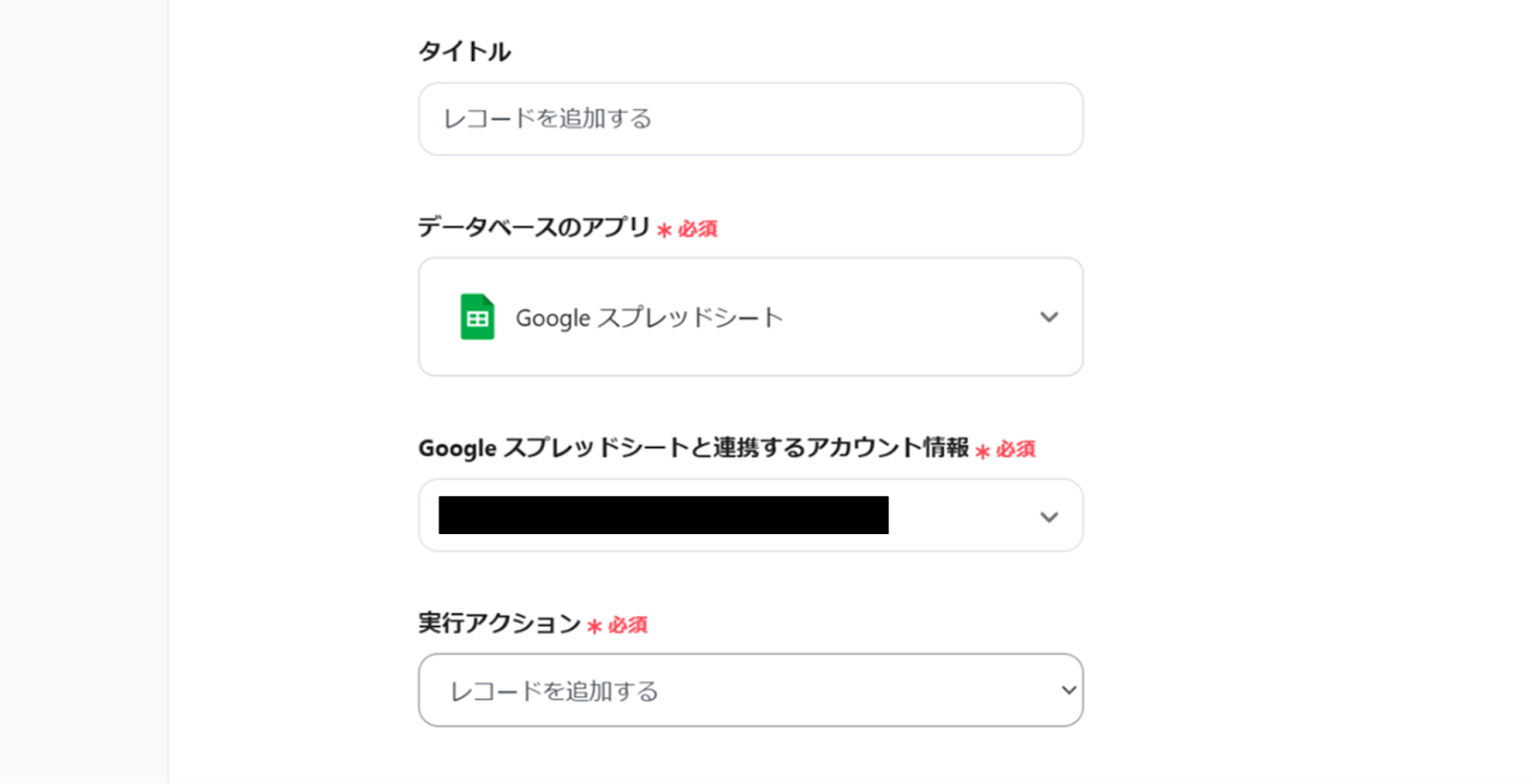 (2)「データベースの連携」画面から、Google スプレッドシートと連携するアカウント情報に誤りがないかを確認し、実行アクションは「レコードを追加する」のままにします。