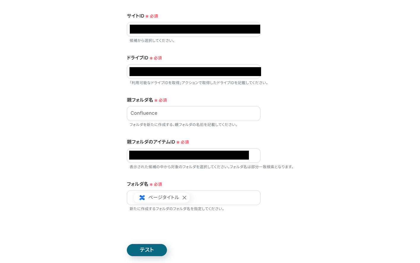 サイトID、ドライブID、親フォルダのアイテムIDは入力欄をクリックすると候補が表示されるので、その中から選択してください。