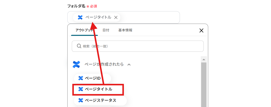 親フォルダ名、フォルダ名を入力するときは、入力欄→ページが作成されたらの順番でクリックすると、以下の画像のようにConfluenceで取得した情報が表示されます。