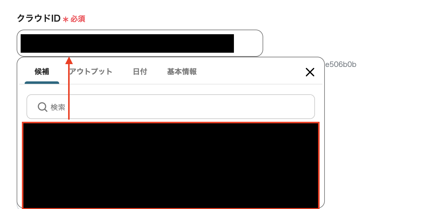 (5)「クラウドID」は、入力バーをクリックすると連携したアカウントの内容に基づいた情報が『候補』に展開されますので、該当するIDを選択しましょう。