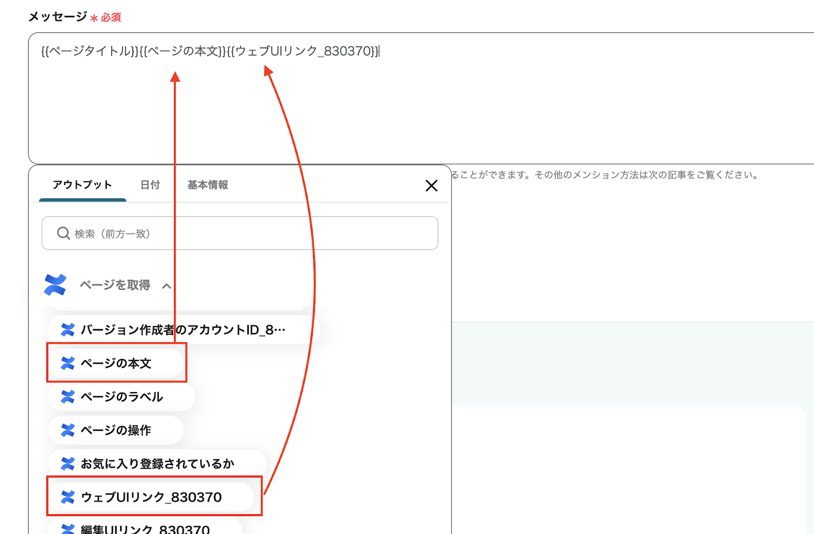 以下の画像のように入力バーをクリックすると、前ステップで取得したアウトプットを引用できます。