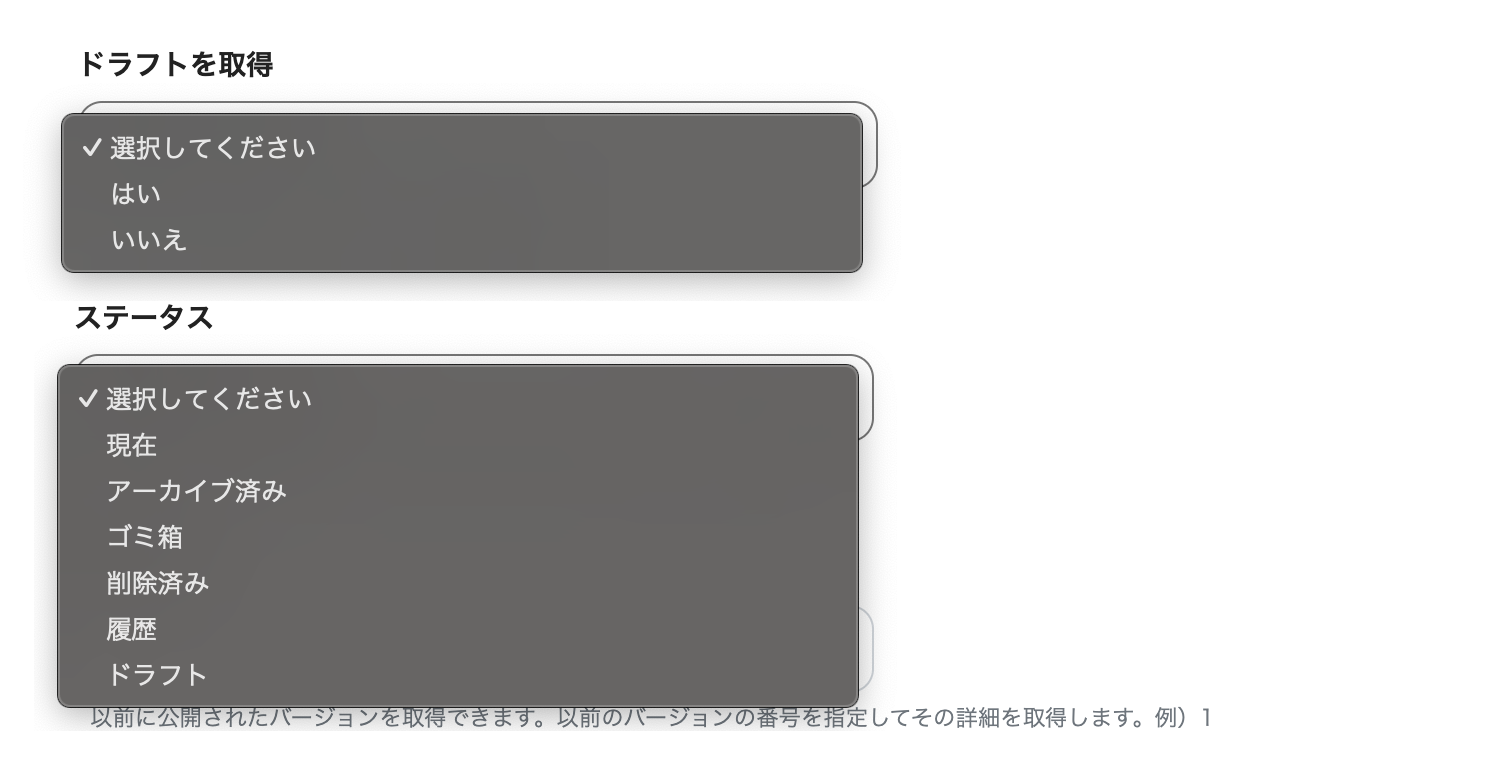 (10)「ドラフトを取得」や「ステータス」は、プルダウンから運用に適したものを選択しましょう。