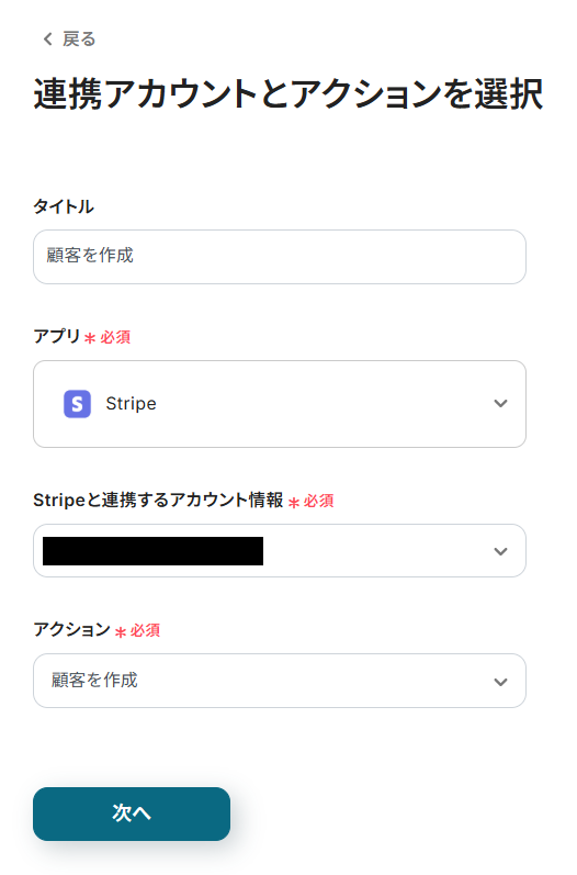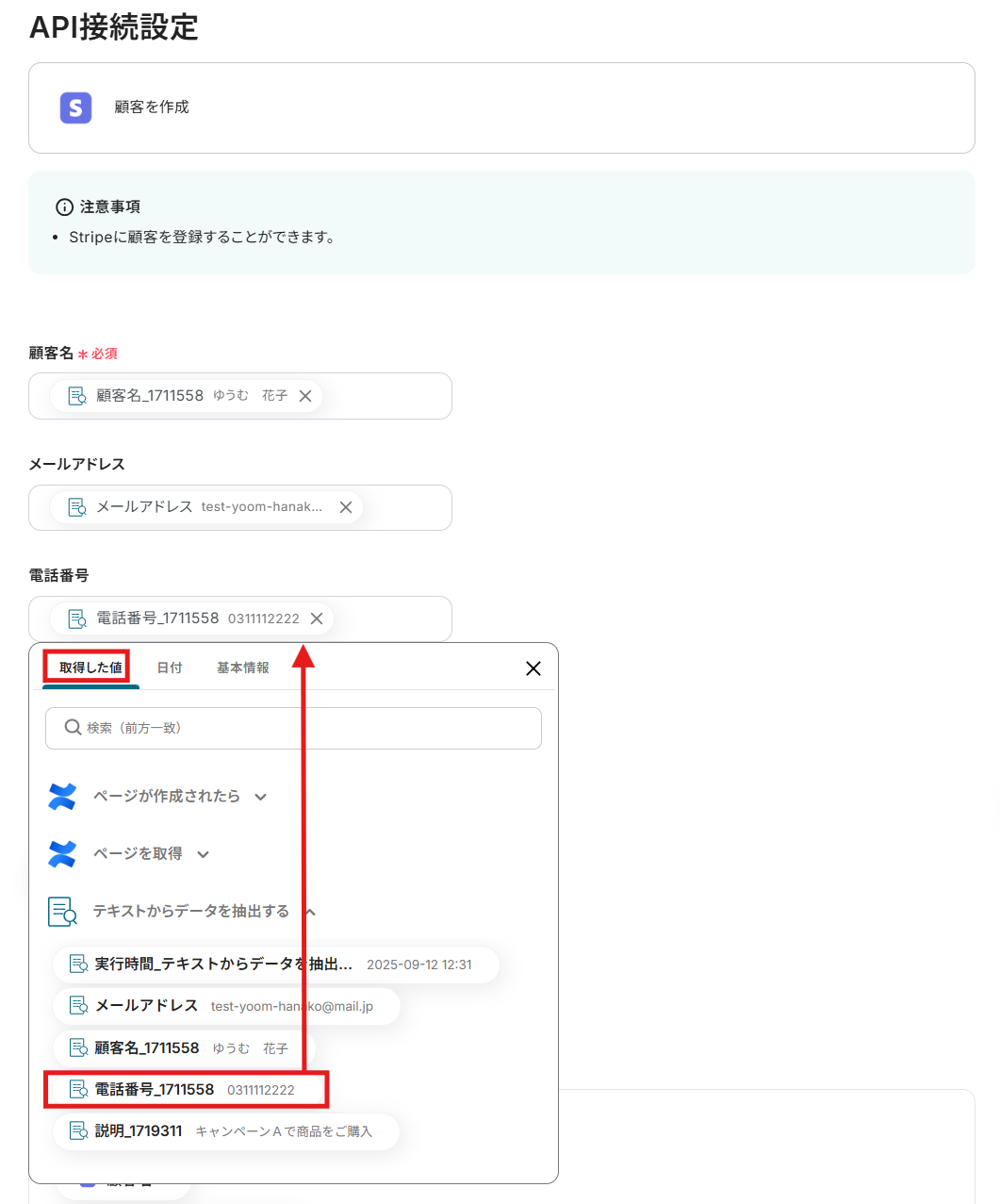 - Stripeで顧客を作成するアクションで、抽出したどの情報をStripeのどの項目(名前、メール、説明など)にマッピングするかを任意で設定してください