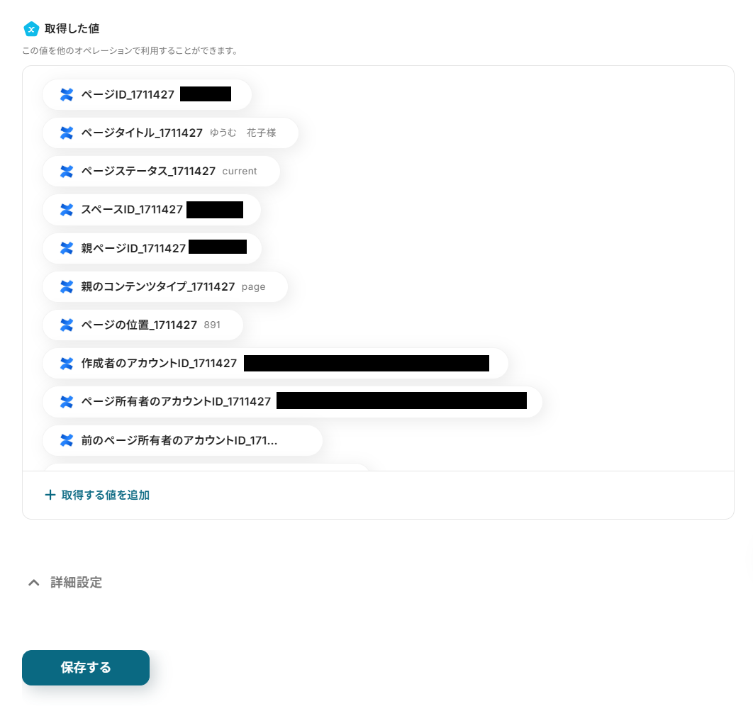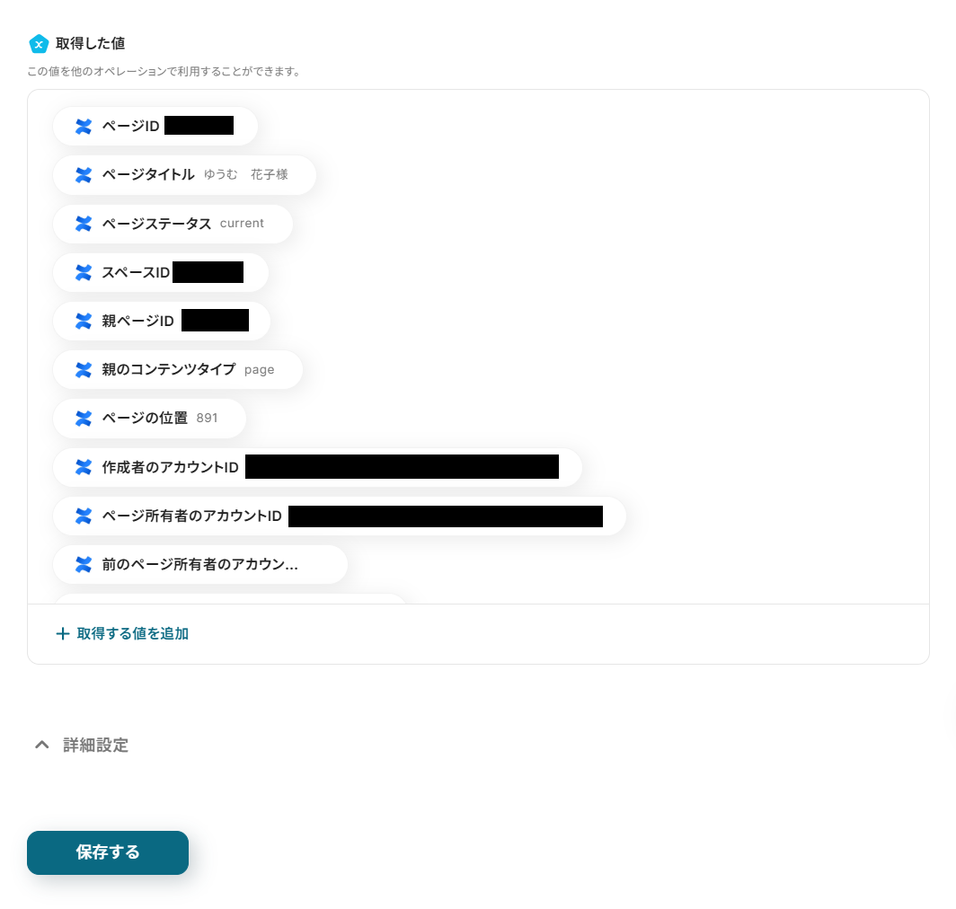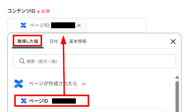 - 次に、オペレーションでConfluenceの「ページを取得」アクションを設定し、作成されたページの詳細情報を取得します。