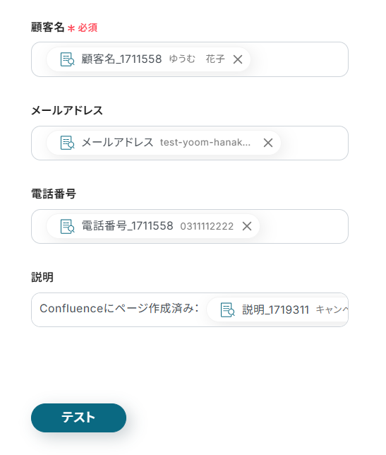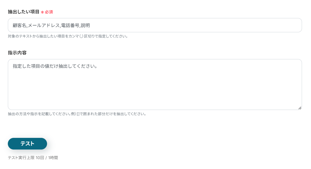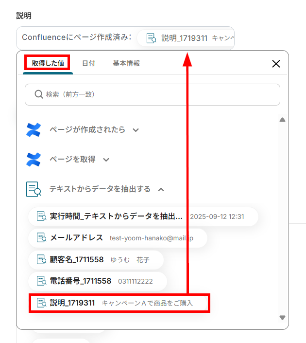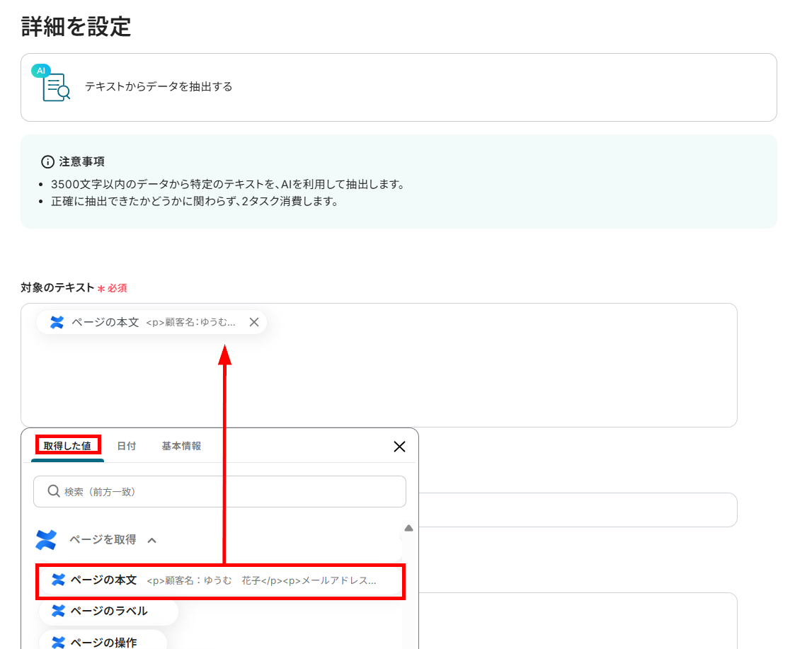 - AI機能の設定で、Confluenceのページ本文から抽出したい情報(顧客名、メールアドレス、住所など)を任意で指定してください