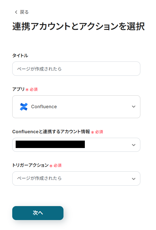 - 次に、トリガーでConfluenceを選択し、「ページが作成されたら」というアクションを設定します。