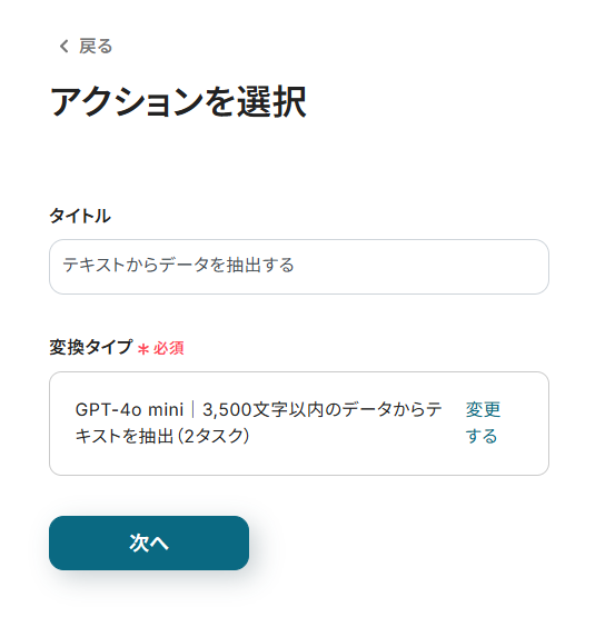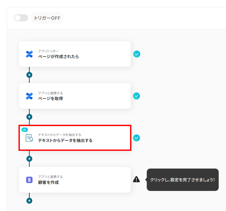 - 次に、オペレーションでAI機能の「テキストからデータを抽出する」を設定し、ページ内容から顧客名やメールアドレスなどの情報を抽出します
