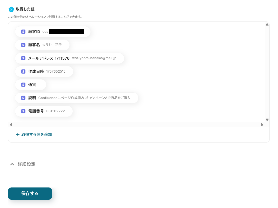 - 最後に、オペレーションでStripeの「顧客を作成」を設定し、抽出した情報をもとに顧客を作成します