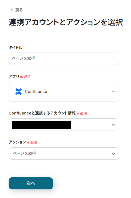 - 続いて、オペレーションでConfluenceの「ページを取得」アクションを設定し、作成されたページの内容を取得します