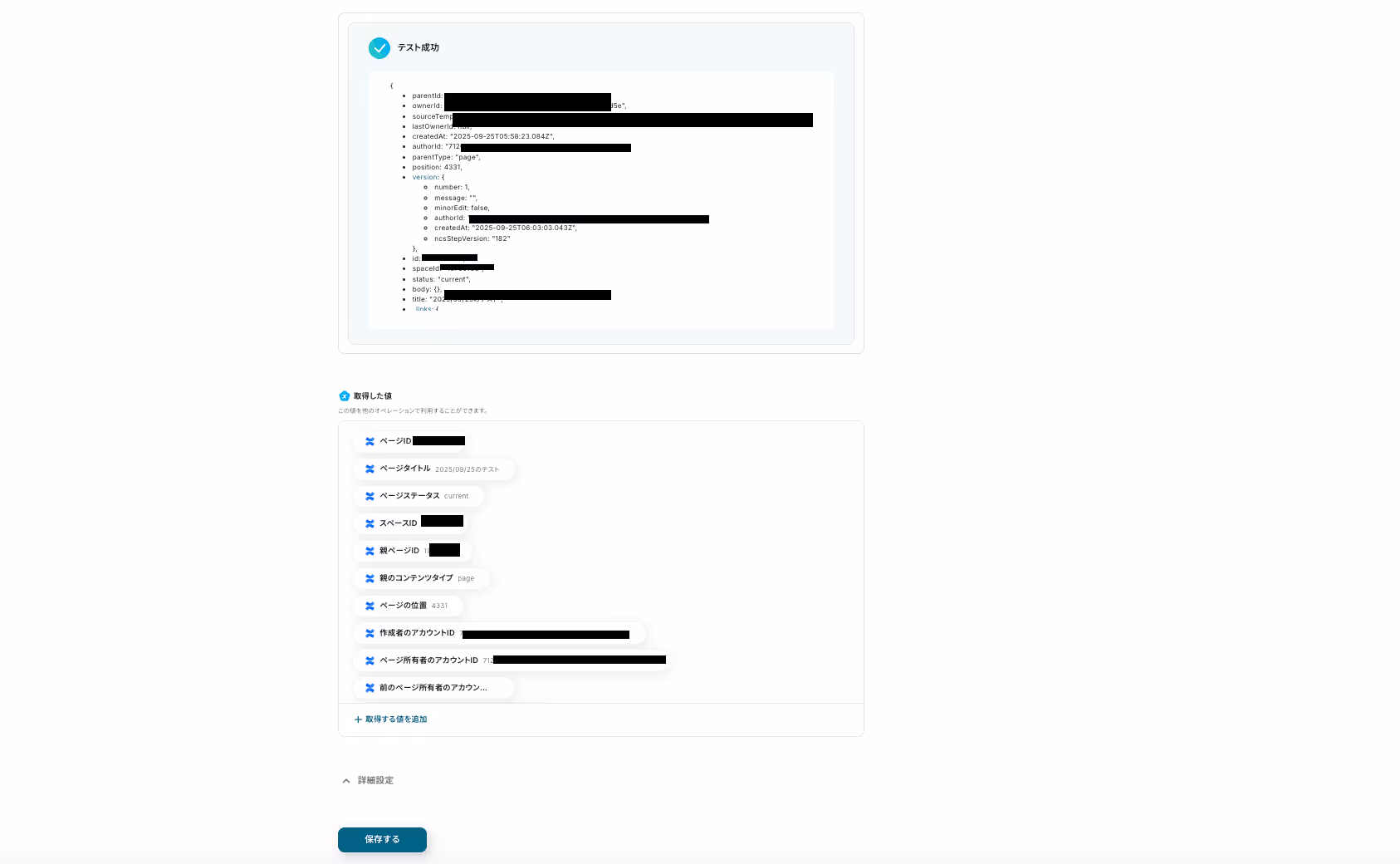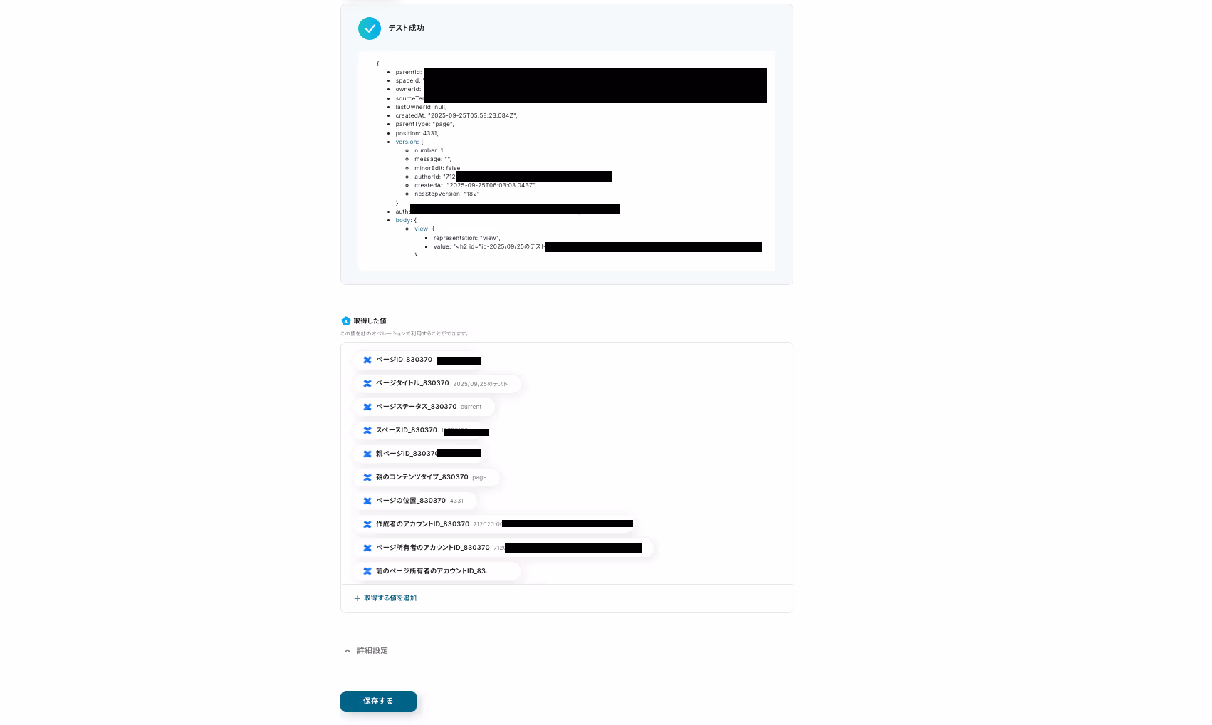 設定ができたら、フローボットのトリガーとなるアクション(今回は新規ページの作成)を行い「テスト」をクリックします。テストに成功すると、以下のように表示されます。取得した値に作成したページの情報が表示されていることを確認して「保存する」を押しましょう。