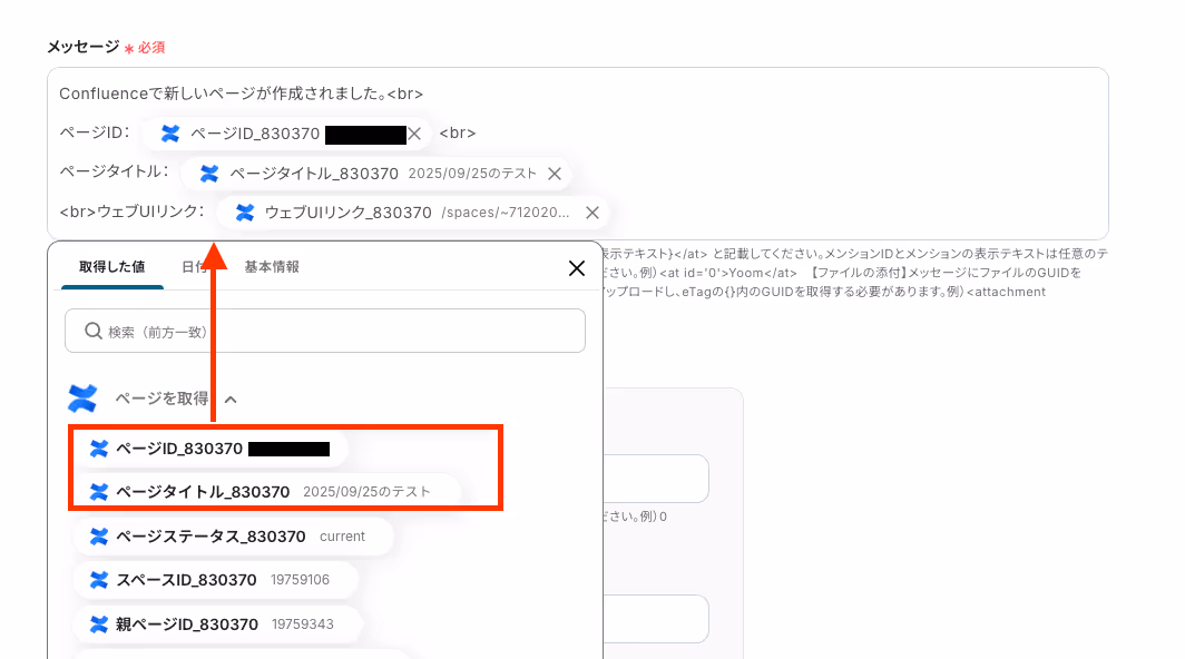 「コンテンツID」は、「ページが作成されたら」のアウトプットから、「ページID」を選択しましょう。