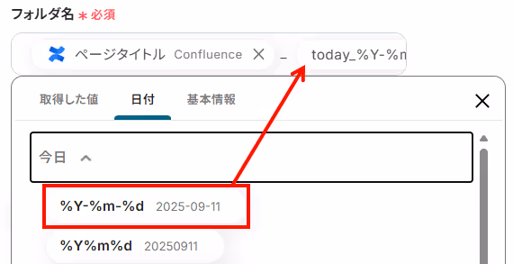 今回は、Confluenceで取得した値を活用してフォルダ名を設定しましたが、例えば【プロジェクト名】_ページタイトル」など、固定テキストを組み合わせることも可能です。